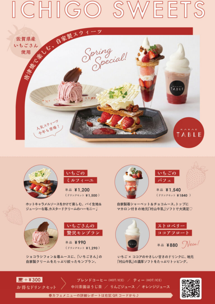 いきいき唐津が企画経営する、KARAE1階のカフェ&ダイニング「KARAE TABLE」では、今年も佐賀県産苺ブランド「いちごさん」を贅沢に使用した春限定メニューが登場!